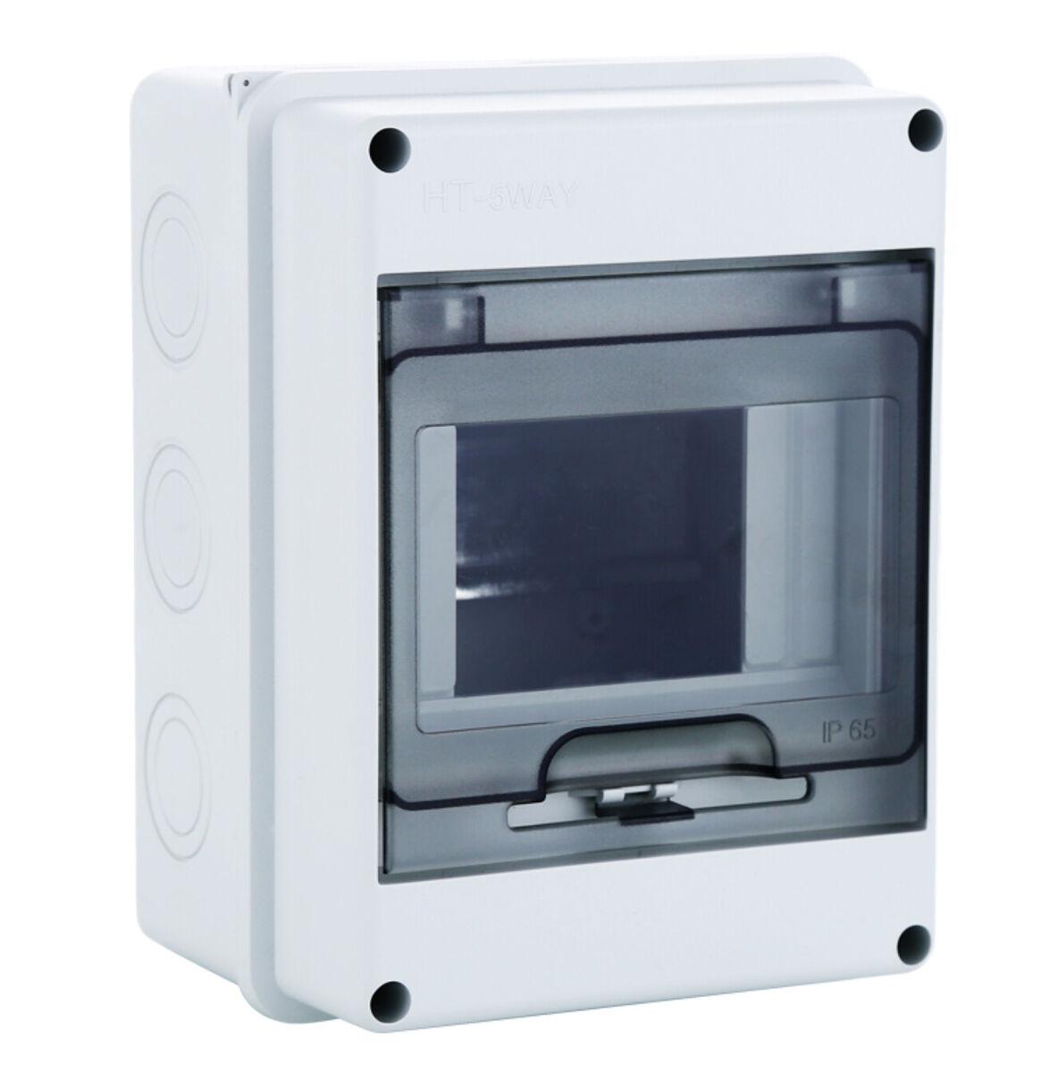 5-way HT5 enclosure box for housing up to 5 DIN-rail mounted circuit breakers or devices.